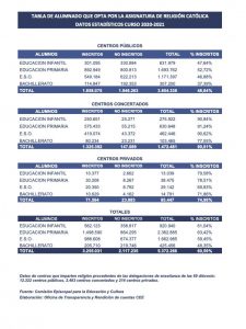 La Comisión Episcopal para la Educación y Cultura comparte, como cada año escolar, los datos estadísticos del alumnado que opta por la asignatura de Religión Católica en este curso 2020-21. No se trata de una encuesta, sino de una compilación de datos reales obtenidos por las 69 delegaciones diocesanas de Enseñanza. Estos resultados son la suma de datos de un total de 15.029 centros públicos, concertados y privados. Se trata, por tanto, de una información contrastada fruto del trabajo de las delegaciones diocesanas de Enseñanza, que esta Comisión Episcopal agradece.