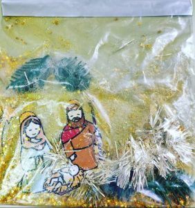 También, les facilito una bolsa sensorial con elementos navideños, para realizarla he introducido el pictograma de la navidad y objetos como estrellas, purpurina, o hojas de abeto, junto con gomina para que puedan manipularlos y buscarlos tocando la bolsa.
