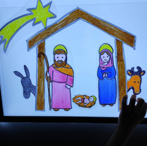 Para presentarles el nacimiento me voy a servir de la mesa de luz, calcando en acetato los pictogramas de sus componentes.