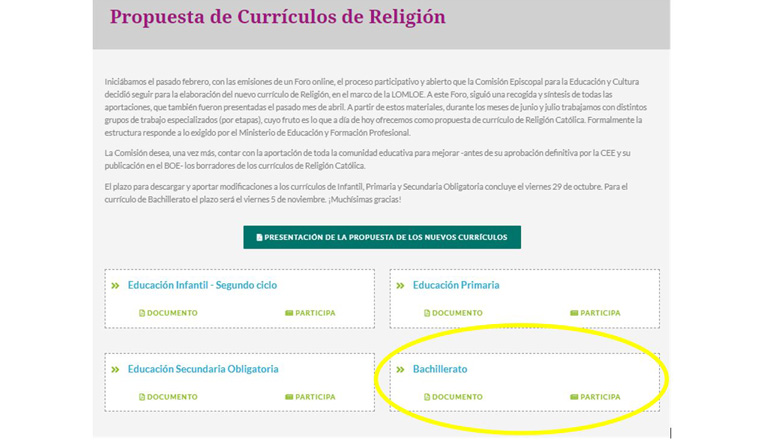 La Comisión Episcopal para la educación y cultura ha subido a la web https://hacianuevocurriculo.educacionyculturacee.es/ la propuesta de currículo para Bachillerato. Disponemos hasta el día 5 de Noviembre para trasladar nuestras aportaciones.