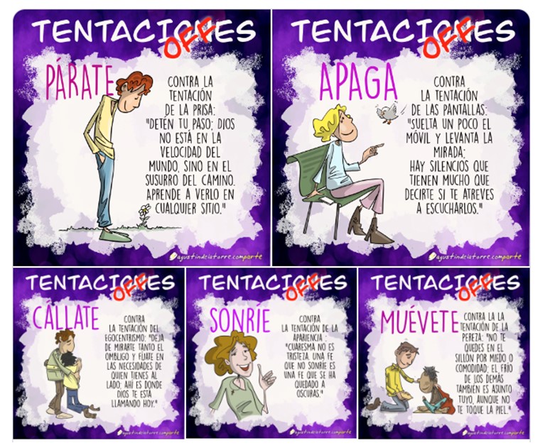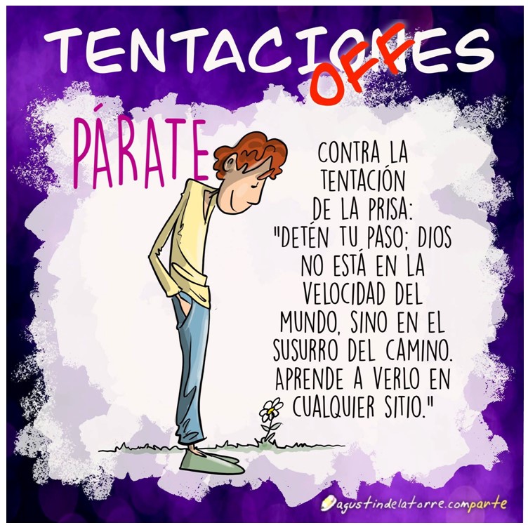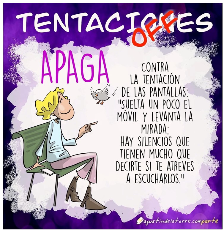 Lo anterior puede ser una sesión. Pero podemos profundizar sobre ello sirviéndonos de las imágenes recientes de Agustín de la Torre, que nos recuerdan que, como Jesús fue tentado en el desierto, también nosotros lo somos en nuestro mundo, pero con otro formato. «Hoy las tentaciones no vienen con piedras que se vuelven pan.Vienen disfrazadas de prisa, apariencia, ego, pantallas y comodidad».