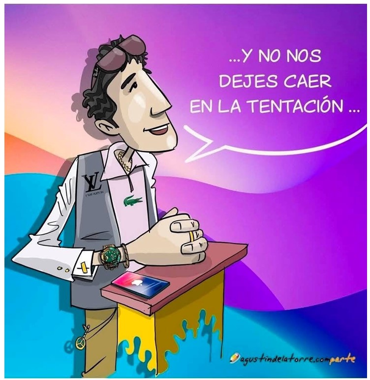 - Nótese que, aunque está de rodillas, y con las manos cruzadas, lleva unos gemelos de oro (y collar, y anillo), las llaves de un coche Mercedes, unas gafas RayBan, un polo de Lacoste, un chaleco de Louis Vuiton, tiene un reloj lujoso y un iPhpone de Apple a la espera… ¿Qué puede significar todo eso?
