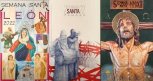 El luminoso cartel de la Semana Santa de León es una obra de Manuel Jáñez realizada en óleo sobre tabla. Dice el autor: «La obra fue concebida como un pregón visual que anunciase no solo la Semana Santa de nuestra ciudad, sino también la liberación del dolor y la tristeza que nos han causado estos dos años sin procesiones ni actos en la calle… La imagen central es Nuestra Señora de la Luz, una talla que recoge el momento en el que la Virgen toma conciencia de que su hijo ha resucitado y, al arrancar de su corazón, la daga del dolor, ésta se va transformando en rosa de esperanza”. Nótese la presencia de la cruz en la estructura del cartel, además de la que lleva Jesús a cuestas ayudado por el Cireneo.