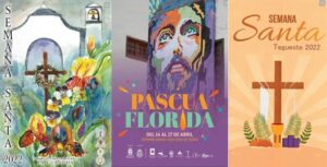Terminamos con tres carteles, todos ellos canarios de Tenerife: La Guancha, Guía de Isora y Tegueste. En el de La Guancha aparece de nuevo la cruz con la corona de espinas, enmarcada en el arco de la iglesia, pero lo central son las flores: la Pascua florida, a la que se alude en concreto en el cartel de Guía de Isora: todo el sentido de la Semana Santa se adquiere desde ahí. Una Pascua que se celebra cada día –especialmente cada domingo– en la eucaristía y que ilumina cada día de la semana, como se simboliza el cartel de Tegueste con el pan y el vino…