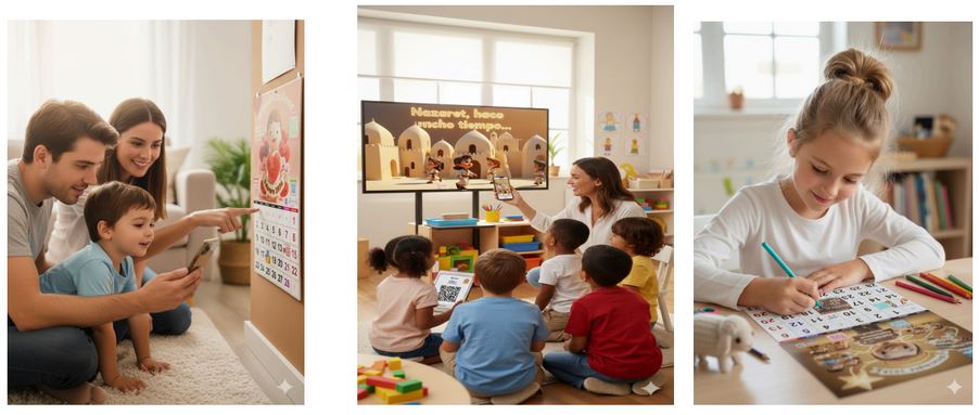 Al escanearlos, los niños acceden a un reel breve y tierno donde Jesús Niño aparece como compañero de juego e inspiración.