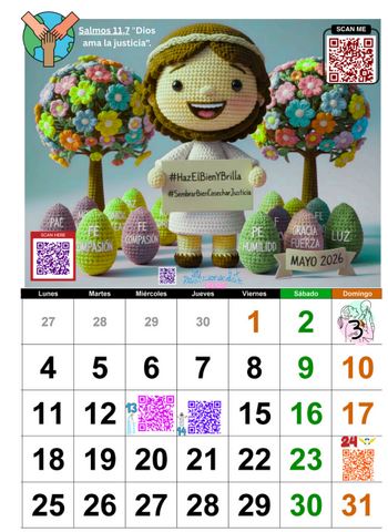 Días señalados: 3 de Mayo (Día de la madre), 13 de mayo (Virgen de Fátima con QR explicativo), 14 de Mayo (Ascensión con QR explicativo), 23 de Mayo (Pentecostés con código QR explicativo).