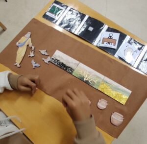 Además, de este material, se ha apoyado la comprensión y la accesibilidad con cada uno de los elementos de manera manipulativa. Este ha sido posible gracias al trabajo de las Hermanas Pobres, que cuentan en su catálogo con materiales de Godly Play, en este caso, les pedí que añadieran texturas a cada uno de los campos, y he de confesar que no pueden estar más logradas. A mi alumnado le encanta tocar cada uno de los campos, sobre todo el de zarzas e indicar que ahí no crece la semilla. Además, el dorado de la tierra buena les enciende la mirada y despierta una sonrisa, indicando que ahí sí que dio fruto la semilla.