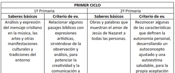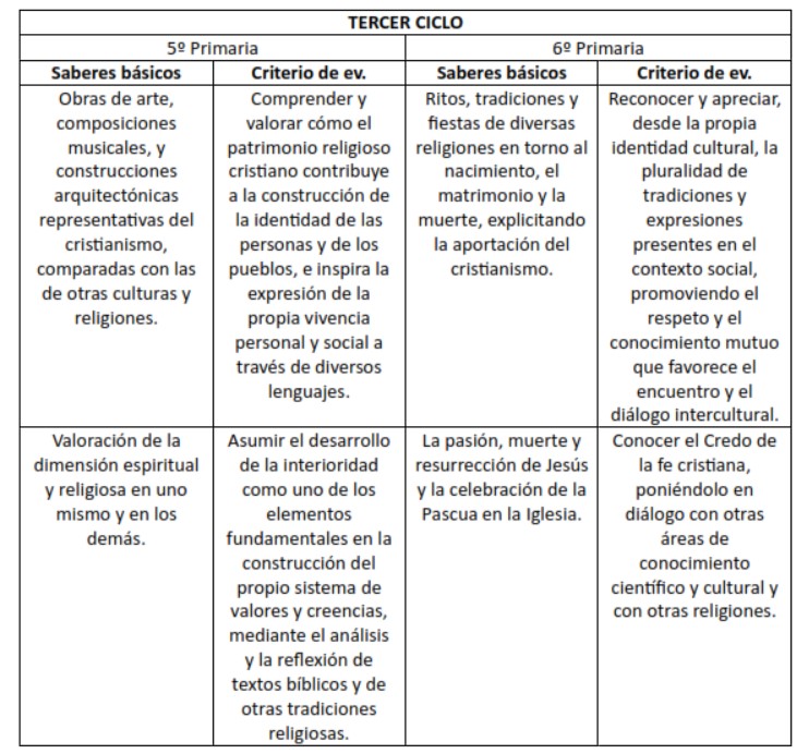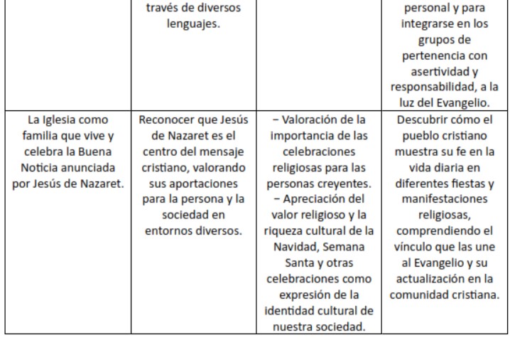 - 6. Comprender los contenidos básicos del cristianismo, valorando su contribución a la sociedad, para disponer de una síntesis personal que permita dialogar, desde la propia identidad social y cultural, con otras tradiciones religiosas y áreas de conocimiento.
