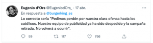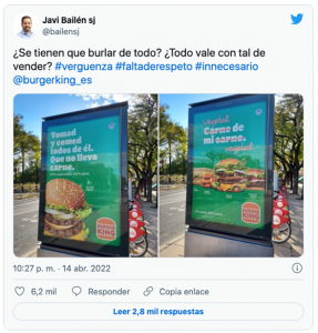 Algunos católicos se sintieron atacados al utilizar esas frases, aunque muchos otros –y también muchos otros ajenos a lo católico– defendían el uso de las frases como un simple chascarrillo o porque aludían al objetivo: vender una hamburguesa vegetal que se podría comer durante la Semana Santa. El caso es que ruido fue grande en las redes sociales. Véanse tan solo dos ejemplos, el primero de ellos de un jesuita que desde Valencia se dedica entre otras cosas a la pastoral deportiva: